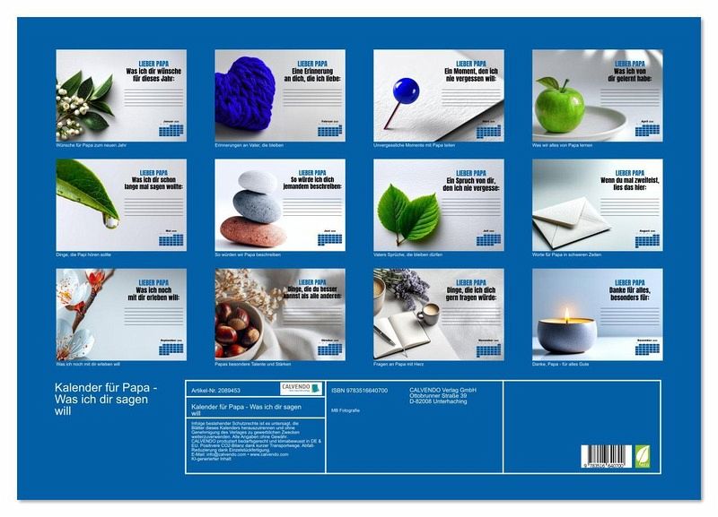 QUALITÄT - Hochwertiger Fotokalender mit 12 wunderschönen Motiven auf lichtbeständigem Bilderdruckpapier, robuste Spiralbindung mit Aufhängebügel.NACHHALTIG - deutliche Abfallreduzierung durch bedarfsgerechte Einzelstückfertigung, umweltfreundliches FSC-zertifiziertes Papier, Produktion in Deutschland, klimabewusste Logistik.PERFEKTES GESCHENK - Kalender für Freunde und Familie, für Kinder und Erwachsene, jung und alt, zu Weihnachten, Geburtstag oder zwischendurch.VIELFALT - Bildkalender in verschiedenen Formaten, z.B. DIN A5, DIN A4, DIN A3 sowie DIN A2. Ob Naturmotiv, Gemälde oder Fotos, ideal für ein persönliches Wohlfühlambiente.Kalender für Papa zum Ausfüllen - das personalisierbare Geschenk für deinen Papa voller Liebe, Erinnerungen und Sprüche. Ein emotionales DIY-Geschenk für Väter, zu Weihnachten oder als persönlicher Kalender für Papas. von Autor(in): Michael Bihlmayer