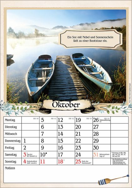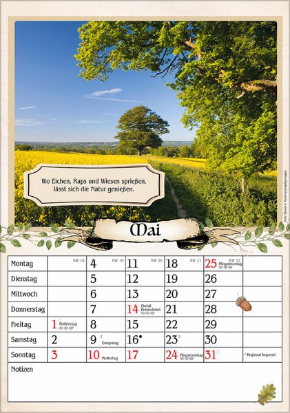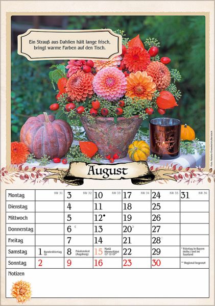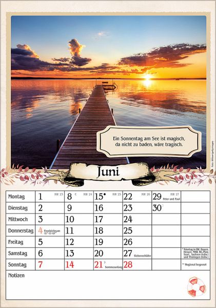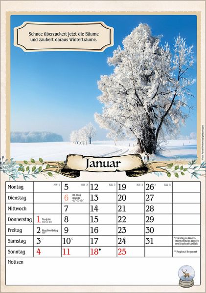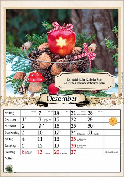 Hervorragende Druckqualität bis ins Detail Deutsches Kalendarium mit Ferienterminen für Deutschland, Österreich und der Schweiz Mit Witzen, Rezepten, Tipps und Bauernregeln auf der Rückseite FSC zertifiziertes Papier aus verantwortungsvollen Quellen