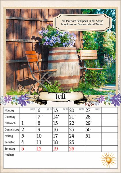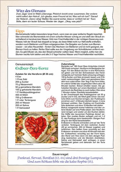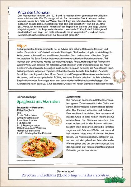 Für Senioren, Rentner und andere Junggebliebene bietet dieser liebevoll gestaltete Wandkalender eine Fülle an Möglichkeiten. Auf der Vorderseite findet man ein praktisches Kalendarium mit Feldern zum Eintragen, kombiniert mit einem stimmungsvollen Foto und einem jahreszeitlich passenden Spruch. Auf den Rückseiten kann man sich an lustigen Witzen, interessanten Tipps, Bauernregeln und leckeren Rezepten erfreuen. Die Rückwand enthält alle Informationen zu Ferienterminen in Deutschland, Österreich und der Schweiz. Der Kalender ist nicht nur das perfekte Geschenk für Eltern, Großeltern, Freunde und Bekannte, sondern auch für sich selbst ein toller Jahresbegleiter, der jeden Tag Freude macht.