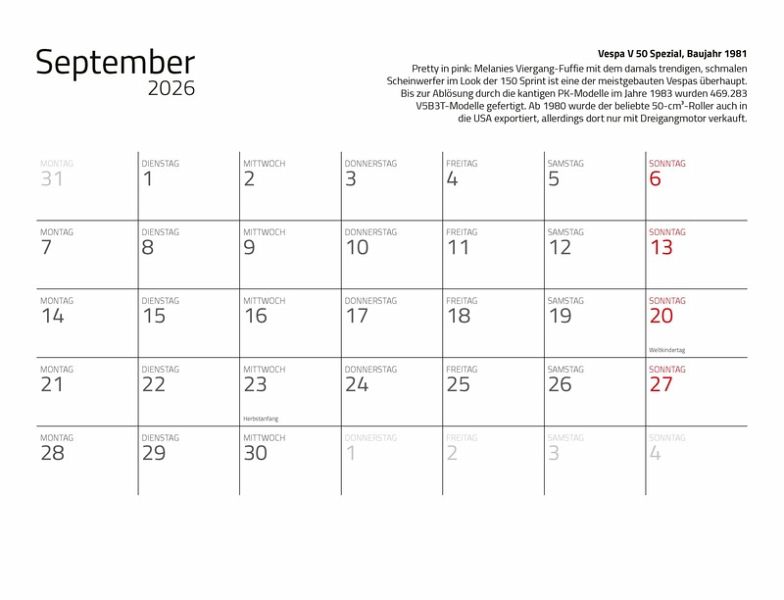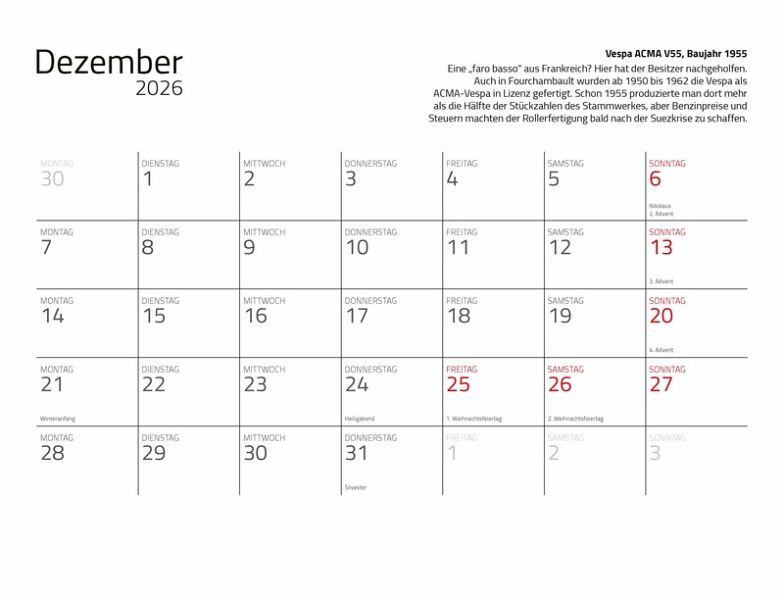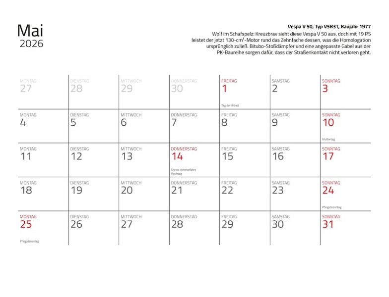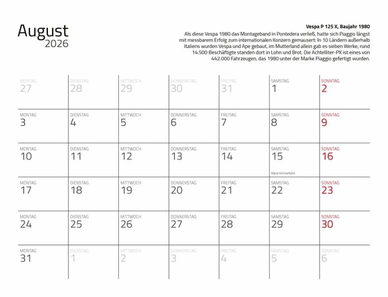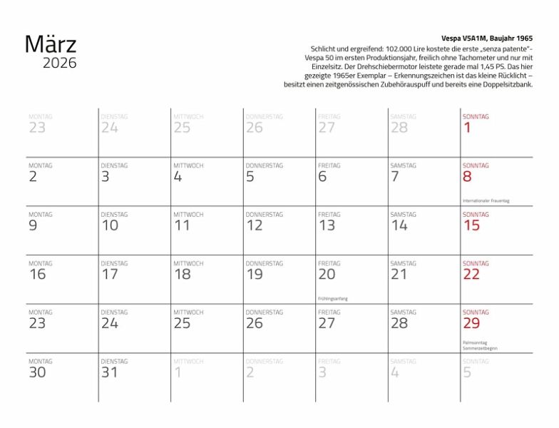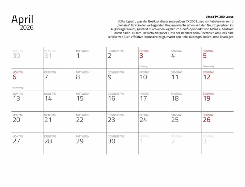 Jetzt auch als Eintragkalender zum Spitzenpreis erhältlich! Der renommierte Fotograf Dieter Rebmann zeigt die ganze Bandbreite des italienischen Kult-Rollers. Mit professionellen Bildern und hochwertiger Ausstattung bringt dieser Wandkalender ein wenig italienisches Lebensgefühl in ihre vier Wände. Mit seinen coolen und abwechslungsreichen Motiven ist dieser Kalender ein wunderbares Geschenk für alle Italien-Fans und Roller-Liebhaber und der perfekte Jahresbegleiter für alle Vespisti.