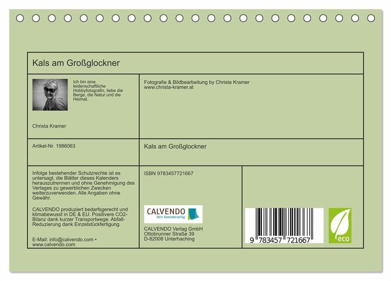 QUALITÄT - Hochwertiger Fotokalender mit 12 wunderschönen Motiven auf lichtbeständigem Bilderdruckpapier, robuste Spiralbindung.NACHHALTIG - deutliche Abfallreduzierung durch bedarfsgerechte Einzelstückfertigung, umweltfreundliches FSC-zertifiziertes Papier, Produktion in Deutschland, klimabewusste Logistik.PERFEKTES GESCHENK - Kalender für Freunde und Familie, für Kinder und Erwachsene, jung und alt, zu Weihnachten, Geburtstag oder zwischendurch.VIELFALT - Bildkalender in verschiedenen Formaten, z.B. DIN A5, DIN A4, DIN A3 sowie DIN A2. Ob Naturmotiv, Gemälde oder Fotos, ideal für ein persönliches Wohlfühlambiente.Impressionen aus Kals am Großglockner im schönen Osttirol von Autor(in): Christa Kramer