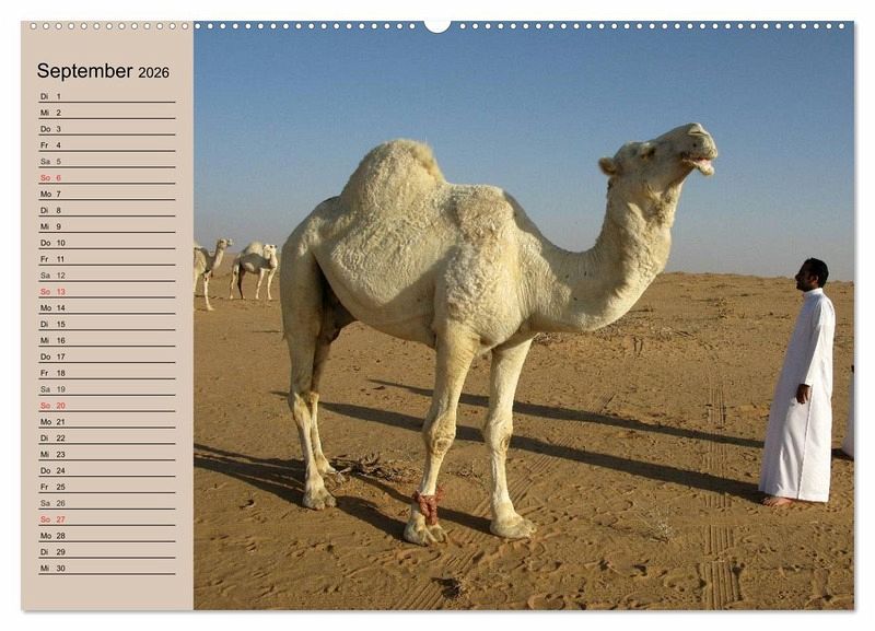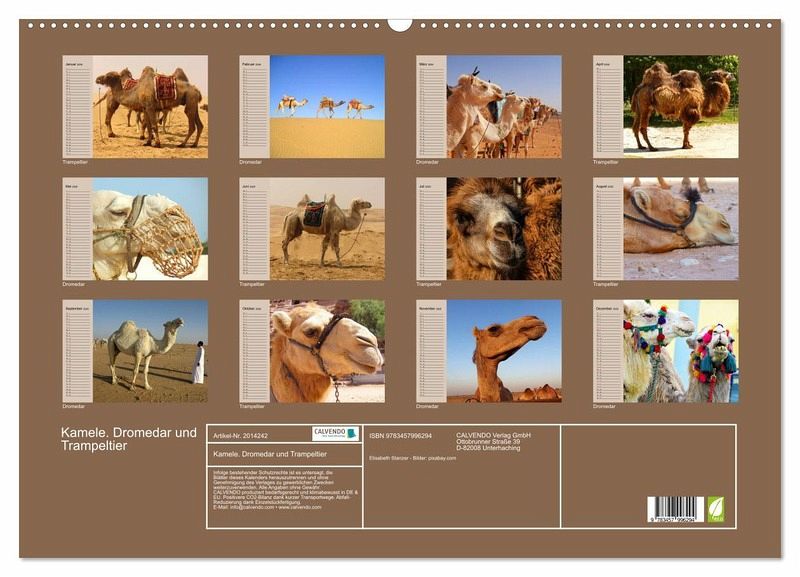 Sie sind genügsam und stark und ihr Blick versprüht eine gewisse Arroganz und Anmut. Sie sind hilfreiche und geduldige Lastenträger. Das zweihöckrige Trampeltier ist in weiten Teilen Asiens verbreitet und es gibt auch noch einen kleinen wildlebenden Bestand. Das einhöckrige Dromedar ist in Afrika und Arabien zuhause und es gibt keine Wildbestände mehr. Ein schöner Kamelplaner für Liebhaber der genialen Wüstenschiffe.