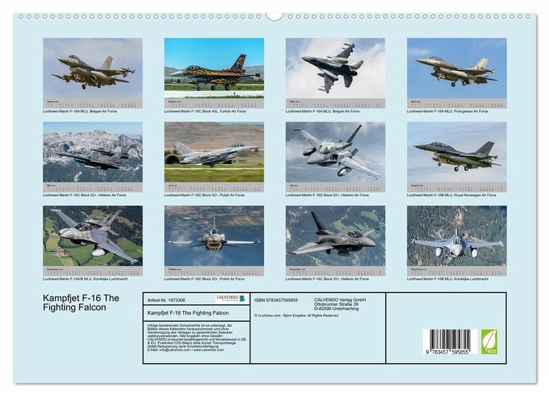 PREMIUM-LINIE - Brillanter Fotokalender mit 12 wunderschönen Motiven, Kunstdruck in Hochglanz in Museumsqualität.QUALITÄT - edle Materialien, stabile Rückwand mit 2 innovativen Einstecktaschen für eine optimale Präsentation an der Wand.NACHHALTIG - deutliche Abfallreduzierung durch bedarfsgerechte Einzelstückfertigung, umweltfreundliches FSC-zertifiziertes Papier, Produktion in Deutschland, klimabewusste Logistik.PERFEKTES GESCHENK - Kalender für Freunde und Familie, für Kinder und Erwachsene, jung und alt, zu Weihnachten, Geburtstag oder zwischendurch.Die F-16 Fighting Falcon, ein zeitloser Jet seit 1976 von Autor(in): Björn Engelke