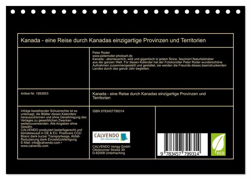 QUALITÄT - Hochwertiger Fotokalender mit 12 wunderschönen Motiven auf lichtbeständigem Bilderdruckpapier, robuste Spiralbindung.NACHHALTIG - deutliche Abfallreduzierung durch bedarfsgerechte Einzelstückfertigung, umweltfreundliches FSC-zertifiziertes Papier, Produktion in Deutschland, klimabewusste Logistik.PERFEKTES GESCHENK - Kalender für Freunde und Familie, für Kinder und Erwachsene, jung und alt, zu Weihnachten, Geburtstag oder zwischendurch.VIELFALT - Bildkalender in verschiedenen Formaten, z.B. DIN A5, DIN A4, DIN A3 sowie DIN A2. Ob Naturmotiv, Gemälde oder Fotos, ideal für ein persönliches Wohlfühlambiente.Kanada, ein traumhaftes Land, atemberaubend in seiner Vielfalt und immer eine Reise wert ist. von Autor(in): Peter Roder