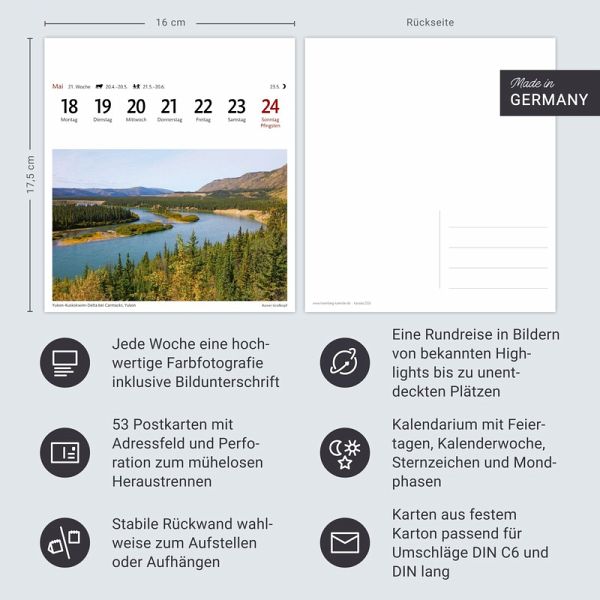 - Auf nach Nordamerika: Kanada von seiner beeindruckendsten Seite in einem kleinen Tischkalender zum Träumen- Woche für Woche atemberaubende Landschaften und stilvolle Naturfotografie: Der kleine Kalender zum Aufstellen oder Aufhängen macht Lust auf eine Fernreise- 53 Postkarten zum Sammeln und Verschicken: ein wunderbares Geschenk für Kanada-Liebhaber- Die charakteristischen Landschaften Kanadas, eingefangen in einem hochwertigen Fotokalender im Format 16 x 17,5 cm- Die perfekte Einstimmung auf Ihre nächste Reise: Kalender von Harenberg aus dem Athesia Kalenderverlag