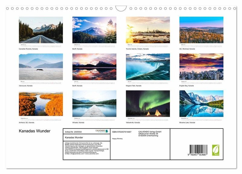 Kanada hat landschaftlich ungelaublich viel zu bieten. Dieser Kalender hält Kanadas unbeschreibliche Natur mit seinen Bildern fest und bringt es in Ihr Zuhause.