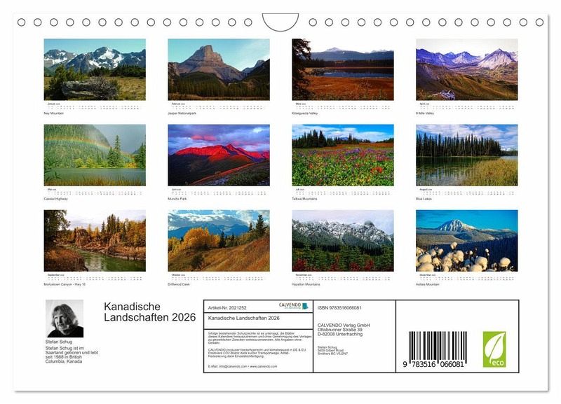 QUALITÄT - Hochwertiger Fotokalender mit 12 wunderschönen Motiven auf lichtbeständigem Bilderdruckpapier, robuste Spiralbindung mit Aufhängebügel.NACHHALTIG - deutliche Abfallreduzierung durch bedarfsgerechte Einzelstückfertigung, umweltfreundliches FSC-zertifiziertes Papier, Produktion in Deutschland, klimabewusste Logistik.PERFEKTES GESCHENK - Kalender für Freunde und Familie, für Kinder und Erwachsene, jung und alt, zu Weihnachten, Geburtstag oder zwischendurch.VIELFALT - Bildkalender in verschiedenen Formaten, z.B. DIN A5, DIN A4, DIN A3 sowie DIN A2. Ob Naturmotiv, Gemälde oder Fotos, ideal für ein persönliches Wohlfühlambiente.Fotografien der atemberaubenden, westkanadischen Wildnis! von Autor(in): Stefan Schug