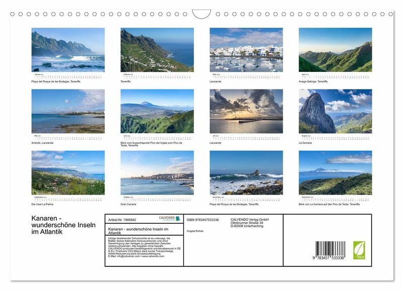QUALITÄT - Hochwertiger Fotokalender mit 12 wunderschönen Motiven auf lichtbeständigem Bilderdruckpapier, robuste Spiralbindung mit Aufhängebügel.NACHHALTIG - deutliche Abfallreduzierung durch bedarfsgerechte Einzelstückfertigung, umweltfreundliches FSC-zertifiziertes Papier, Produktion in Deutschland, klimabewusste Logistik.PERFEKTES GESCHENK - Kalender für Freunde und Familie, für Kinder und Erwachsene, jung und alt, zu Weihnachten, Geburtstag oder zwischendurch.VIELFALT - Bildkalender in verschiedenen Formaten, z.B. DIN A5, DIN A4, DIN A3 sowie DIN A2. Ob Naturmotiv, Gemälde oder Fotos, ideal für ein persönliches Wohlfühlambiente.Eine Entdeckungsreise zu den kanarischen Inseln. von Autor(in): Angela Rohde