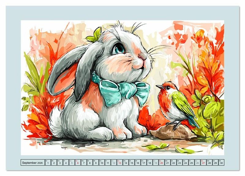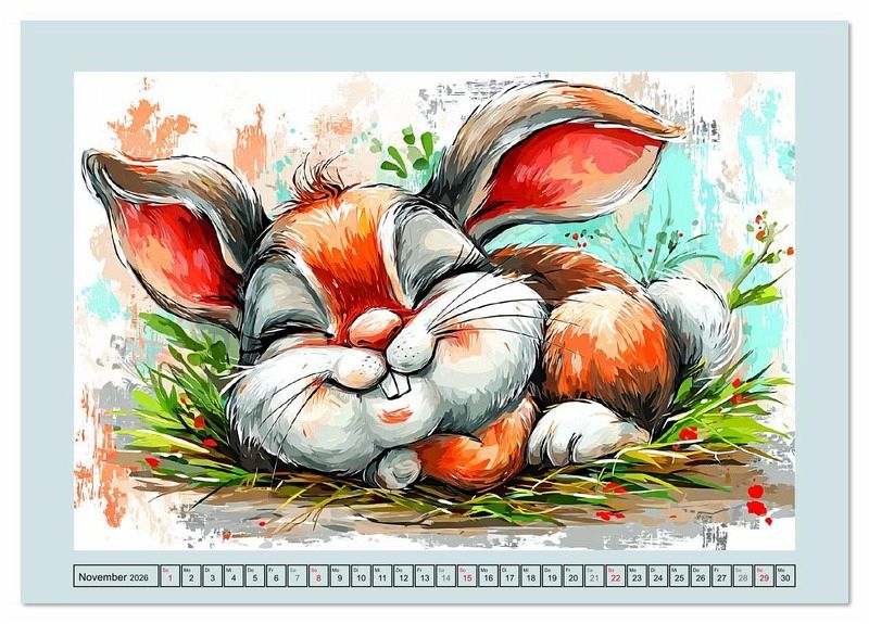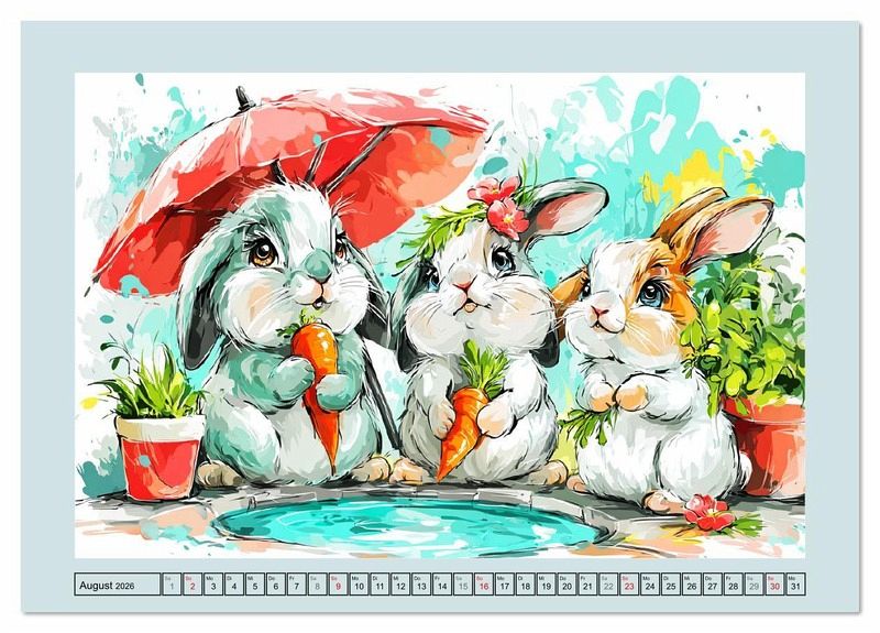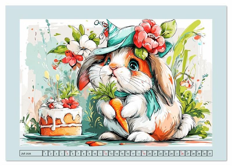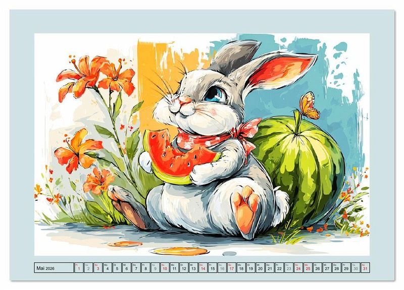 Dieser liebevoll gestaltete Kalender zeigt lustige Kaninchen mit Hut, Halsband oder Weihnachtsmütze. Ob an Ostern oder beim Sommer-Snack - jeden Monat erwartet dich ein süßes Häschenbild. Alle Illustrationen wurden mithilfe von KI erstellt und bringen Freude und Spaß in den Alltag.