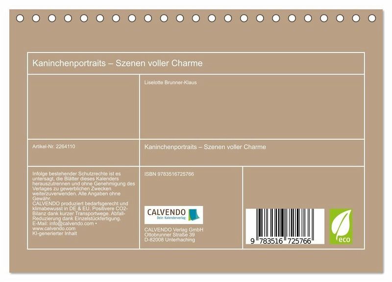 QUALITÄT - Hochwertiger Fotokalender mit 12 wunderschönen Motiven auf lichtbeständigem Bilderdruckpapier, robuste Spiralbindung.NACHHALTIG - deutliche Abfallreduzierung durch bedarfsgerechte Einzelstückfertigung, umweltfreundliches FSC-zertifiziertes Papier, Produktion in Deutschland, klimabewusste Logistik.PERFEKTES GESCHENK - Kalender für Freunde und Familie, für Kinder und Erwachsene, jung und alt, zu Weihnachten, Geburtstag oder zwischendurch.VIELFALT - Bildkalender in verschiedenen Formaten, z.B. DIN A5, DIN A4, DIN A3 sowie DIN A2. Ob Naturmotiv, Gemälde oder Fotos, ideal für ein persönliches Wohlfühlambiente.Kaninchen im künstlerischen Realismus von Autor(in): Liselotte Brunner-Klaus