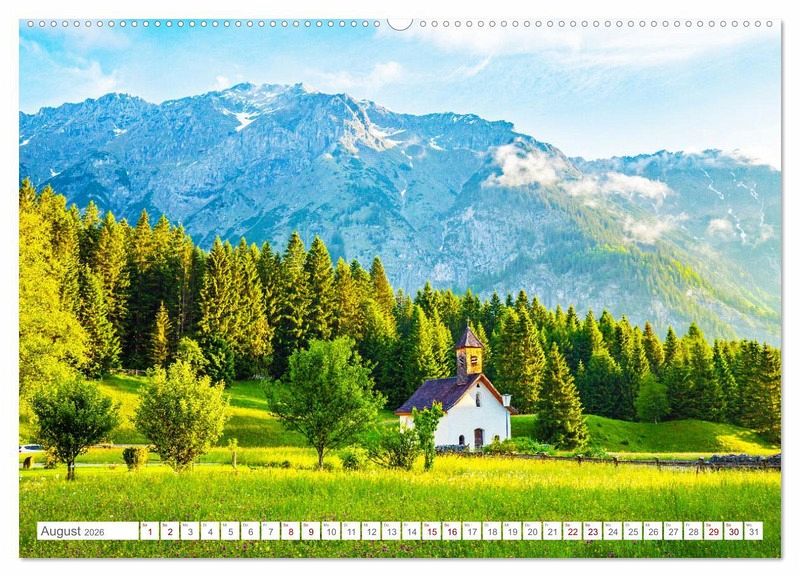 August: Die Kapelle Reindlau vor dem mächtigen Wettersteinkamm.