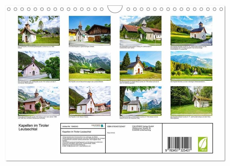 QUALITÄT - Hochwertiger Fotokalender mit 12 wunderschönen Motiven auf lichtbeständigem Bilderdruckpapier, robuste Spiralbindung mit Aufhängebügel.NACHHALTIG - deutliche Abfallreduzierung durch bedarfsgerechte Einzelstückfertigung, umweltfreundliches FSC-zertifiziertes Papier, Produktion in Deutschland, klimabewusste Logistik.PERFEKTES GESCHENK - Kalender für Freunde und Familie, für Kinder und Erwachsene, jung und alt, zu Weihnachten, Geburtstag oder zwischendurch.VIELFALT - Bildkalender in verschiedenen Formaten, z.B. DIN A5, DIN A4, DIN A3 sowie DIN A2. Ob Naturmotiv, Gemälde oder Fotos, ideal für ein persönliches Wohlfühlambiente.Das Leutaschtal erstreckt sich auf einer Länge von ca. 16 Kilometern und besteht aus 24 Ortsteilen mit zahlreichen Kapellen. von Autor(in): Klaus Scholz