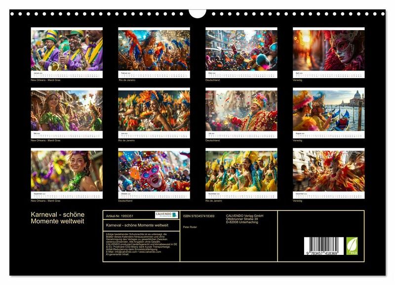 Begeben Sie sich auf eine Reise des Karneval-Feierns. Erleben Sie das ausgelassene Treiben des Mardi Gras in New Orleans, wo farbenfrohe Paraden und lebhafte Straßenfeste die Oberhand gewinnen. Spüren Sie die pulsierende Energie der mit Samba gefüllten Straßen von Rio de Janeiro. Betrachten Sie die traditionellen deutschen Festivitäten mit ausgelassenen Umzügen. Tauchen Sie ein in den venezianischen Karneval, in der kunstvolle Masken und prächtige Bälle Sie in Staunen versetzen. Der Fotokünstler Peter Roder hat beeindruckende KI-Bilder gestaltet. Ein außergewöhnlicher Kalender, der die Vielfalt des Karnevals präsentiert.