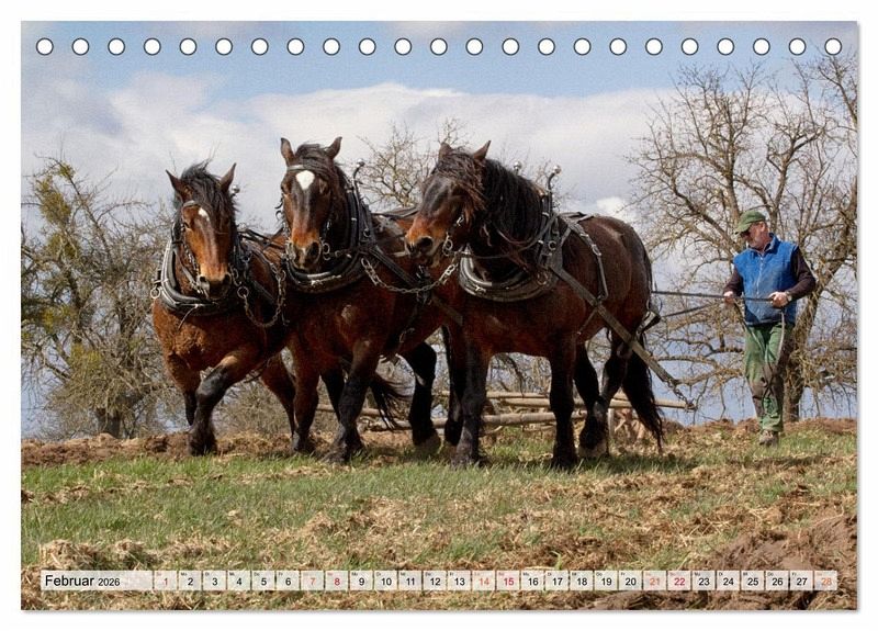 Februar: Drei Noriker ziehen einen 2-Schar Beetpflug durch den lehmigen Boden.