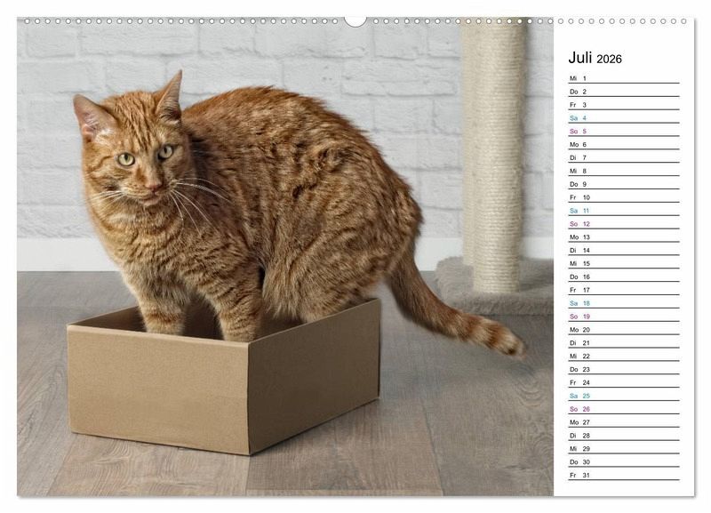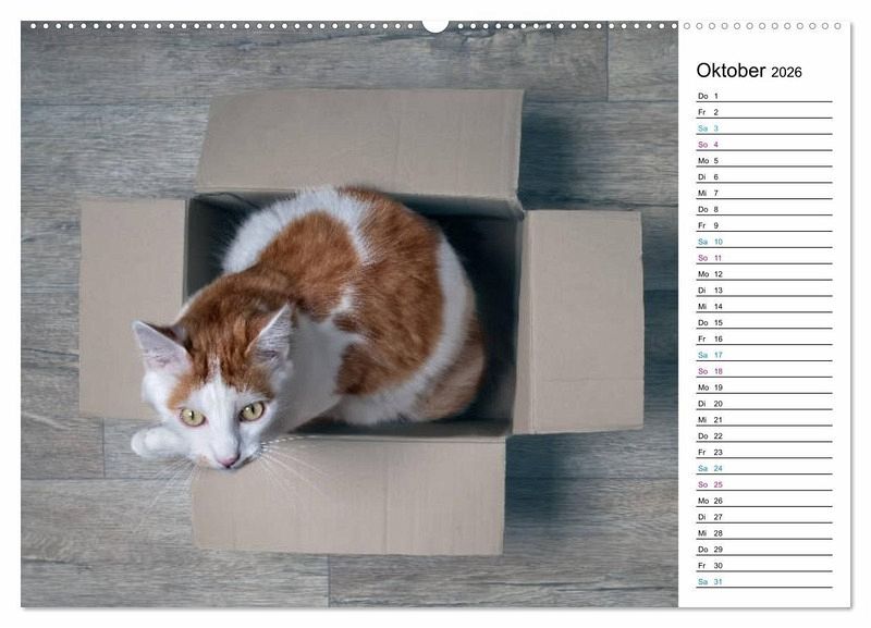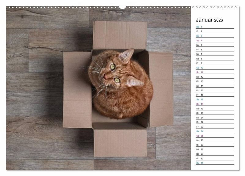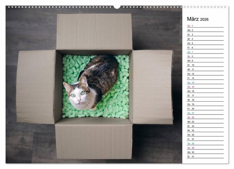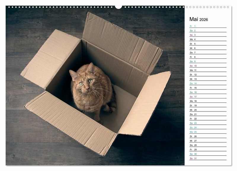 Katzen und Kartons - Diese Beziehung scheint perfekt. Dabei ist es egal wie groß die Kiste ist, Hauptsache sie passen irgendwie hinein. Diese Karton-Katzen werden Sie jeden Monat mit einem neuen Bild erfreuen und gleichzeitig bietet Ihnen der Kalender genügend Platz um Ihre Termine einzutragen.