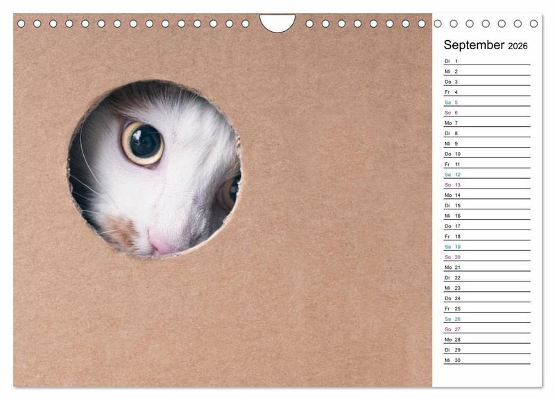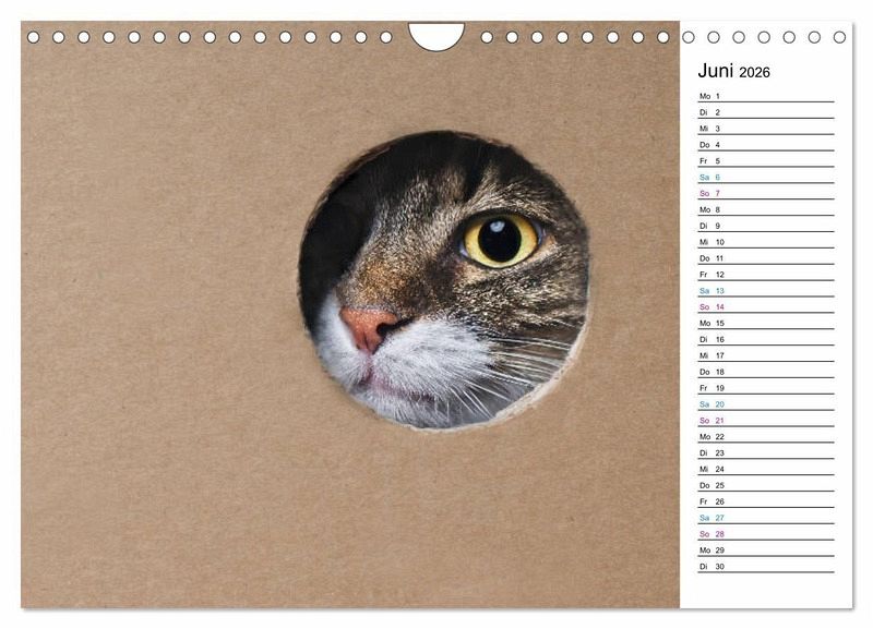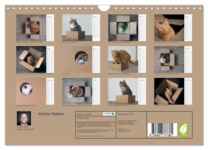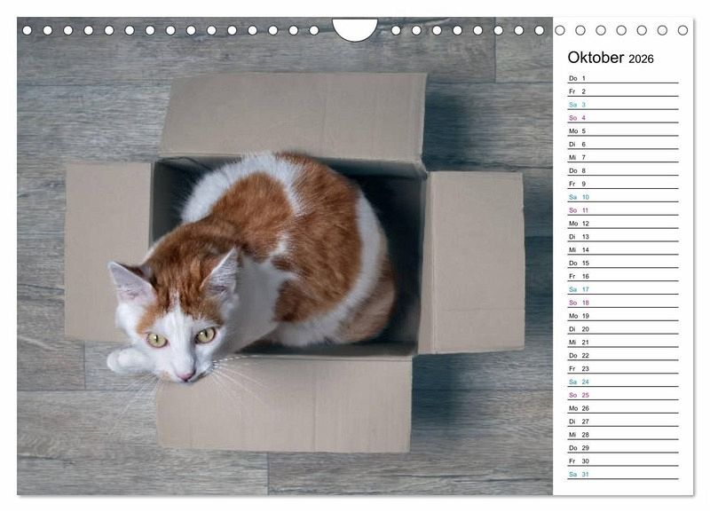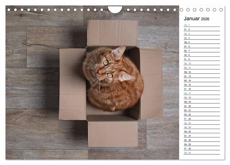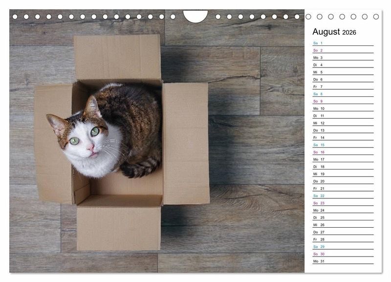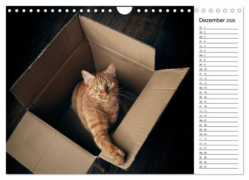 Katzen und Kartons - Diese Beziehung scheint perfekt. Dabei ist es egal wie groß die Kiste ist, Hauptsache sie passen irgendwie hinein. Diese Karton-Katzen werden Sie jeden Monat mit einem neuen Bild erfreuen und gleichzeitig bietet Ihnen der Kalender genügend Platz um Ihre Termine einzutragen.
