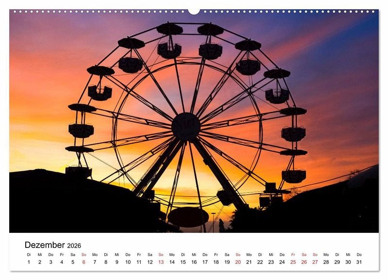 Dezember: Sonnenaufgang hinter dem Riesenrad auf dem Weihnachtsmarkt