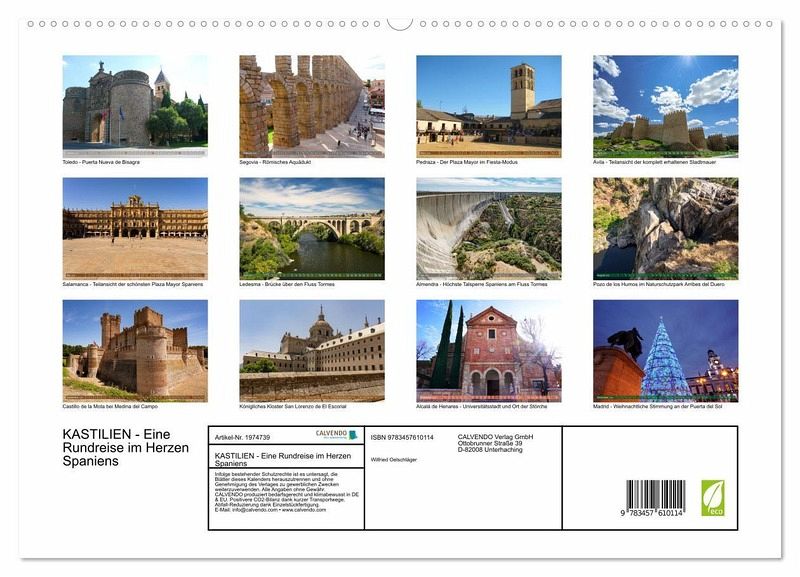QUALITÄT - Hochwertiger Fotokalender mit 12 wunderschönen Motiven auf lichtbeständigem Bilderdruckpapier, robuste Spiralbindung mit Aufhängebügel.NACHHALTIG - deutliche Abfallreduzierung durch bedarfsgerechte Einzelstückfertigung, umweltfreundliches FSC-zertifiziertes Papier, Produktion in Deutschland, klimabewusste Logistik.PERFEKTES GESCHENK - Kalender für Freunde und Familie, für Kinder und Erwachsene, jung und alt, zu Weihnachten, Geburtstag oder zwischendurch.VIELFALT - Bildkalender in verschiedenen Formaten, z.B. DIN A5, DIN A4, DIN A3 sowie DIN A2. Ob Naturmotiv, Gemälde oder Fotos, ideal für ein persönliches Wohlfühlambiente.Ein Besuch der schönsten Orte Kastiliens. von Autor(in): Wilfried Oelschläger