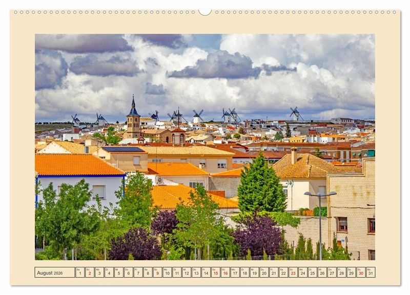 August: Windmühlen und Dächer über Campo di Criptana