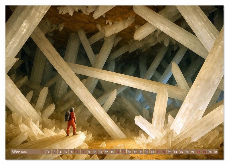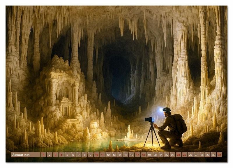 Mit Hilfe von KI gestaltete Bildwelten führen tief unter die Erde - dorthin, wo Licht auf Stein trifft und Stille Form annimmt. Riesige Tropfsteinhallen, glitzernde Kristalle und einsame Forscher begegnen sich in Szenen voller Ehrfurcht. Jede Aufnahme erzählt von verborgener Schönheit und dem Staunen des Menschen im Angesicht der Tiefe. Eine Hommage an das Unsichtbare - kraftvoll, klar und zeitlos.
