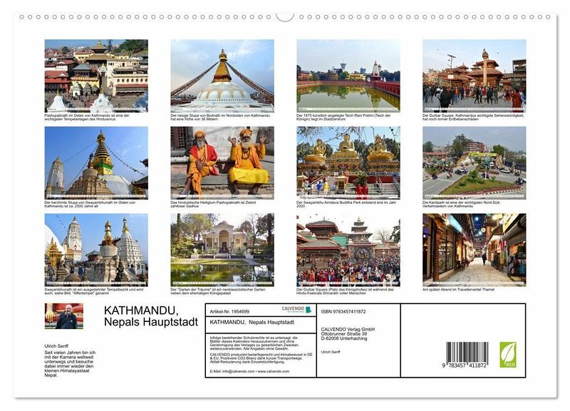 Die fantastische Landschaft der Himalayaregion lockt alljährlich unzählige Touristen nach Nepal. Kathmandu ist der Ausgangsort für alle weiteren Dinge, die man im Lande unternehmen möchte. Die quirlige Stadt im Herzen des Kathmandutals bietet bereits ein unvergessliches Erlebnis. Kathmandu verkörpert alles, angefangen von unzähligen Baudenkmälern, wie außergewöhnlichen buddhistischen Stupas, hinduistischen Tempelanlagen wie Pashupatinath, den einzigartigen Durbar Square, eine sehenswerte historische Altstadt, ungemein freundliche Menschen, aber auch Smog, Verkehrschaos und Hektik. Der Autor besuchte viele Male den kleinen Nepalstaat und zeigt im Kalender einige seiner beeindruckenden Fotos von Kathmandu.