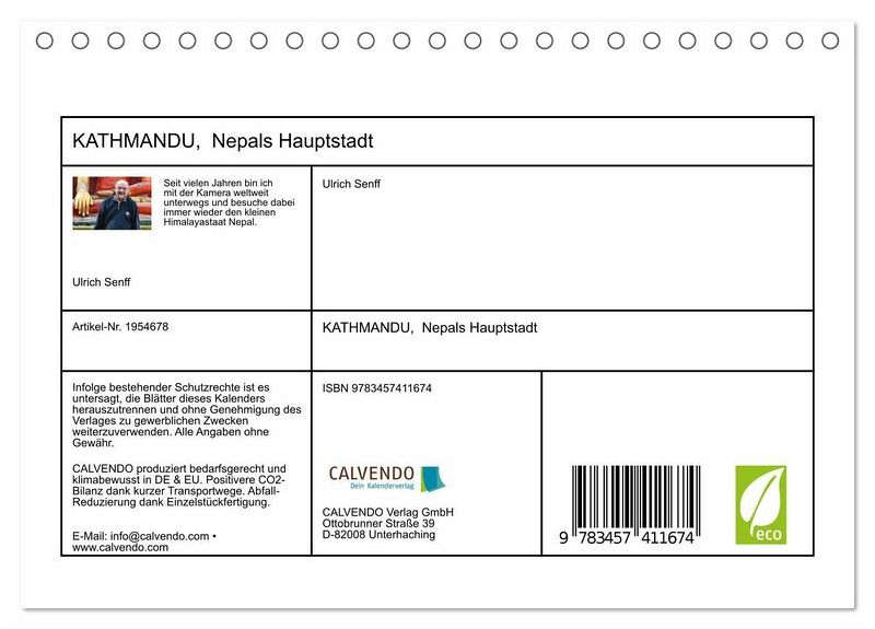 Die fantastische Landschaft der Himalayaregion lockt alljährlich unzählige Touristen nach Nepal. Kathmandu ist der Ausgangsort für alle weiteren Dinge, die man im Lande unternehmen möchte. Die quirlige Stadt im Herzen des Kathmandutals bietet bereits ein unvergessliches Erlebnis. Kathmandu verkörpert alles, angefangen von unzähligen Baudenkmälern, wie außergewöhnlichen buddhistischen Stupas, hinduistischen Tempelanlagen wie Pashupatinath, den einzigartigen Durbar Square, eine sehenswerte historische Altstadt, ungemein freundliche Menschen, aber auch Smog, Verkehrschaos und Hektik. Der Autor besuchte viele Male den kleinen Nepalstaat und zeigt im Kalender einige seiner beeindruckenden Fotos von Kathmandu.