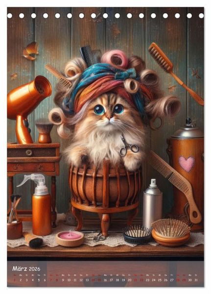 März: Ein kleines Boho Kätzchen bei Friseur, mit Schere, Fön, Bürste und Lockenwicklern