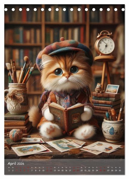 April: Ein künstlerisches Kätzchen in einer Bibliothek beim lesen eines Buches