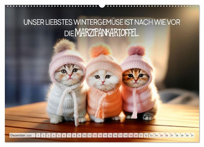 Entdecken Sie unsere bezaubernden Stubentiger mit menschlichen Eigenschaften in den unterschiedlichsten Situationen. 12 lustige Aussagen versüßen das Jahr. Sicherlich finden Sie sich auch in dem einen oder anderen Thema wieder. Die Motive wurden in Zusammenarbeit mit künstlicher Intelligenz und ohne Tierleid erschaffen.