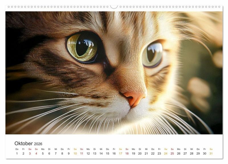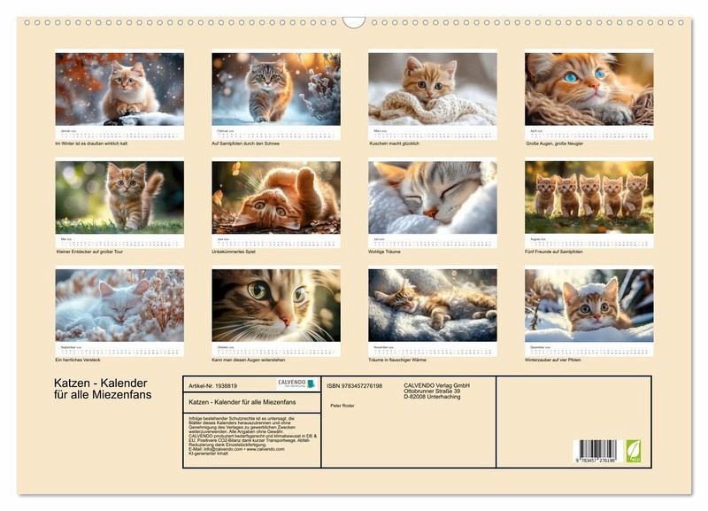Jeden Monat ein neues Kätzchen, das Ihr Herz erobert. Lassen Sie sich verzaubern von der Niedlichkeit und dem Charme dieser kleinen, bezaubernden Katzen. Jede Szene ist liebevoll und kunstvoll von KI kreiert - jedes Motiv ein kleines Meisterwerk. Beobachten Sie, wie neugierige Kätzchen mit großen Augen ihre Welt entdecken, wie sie friedlich schlummern oder verspielt durch den Schnee tollen. Spüren Sie die Harmonie, wenn fünf winzige Samtpfoten synchron über eine Wiese tapsen. Perfekt für Katzenliebhaber, die das ganze Jahr über mit bezaubernden Motiven begleitet werden möchten und auch für Sie selbst oder Ihre Liebsten.