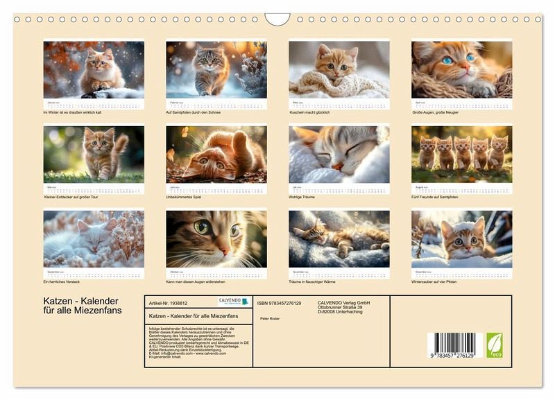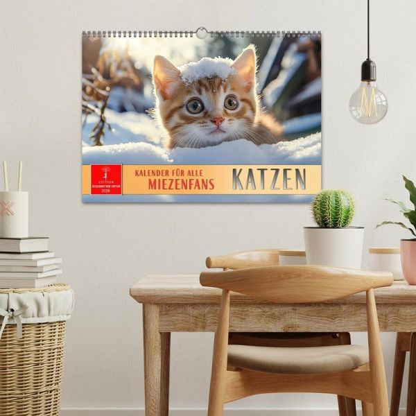 Jeden Monat ein neues Kätzchen, das Ihr Herz erobert. Lassen Sie sich verzaubern von der Niedlichkeit und dem Charme dieser kleinen, bezaubernden Katzen. Jede Szene ist liebevoll und kunstvoll von KI kreiert - jedes Motiv ein kleines Meisterwerk. Beobachten Sie, wie neugierige Kätzchen mit großen Augen ihre Welt entdecken, wie sie friedlich schlummern oder verspielt durch den Schnee tollen. Spüren Sie die Harmonie, wenn fünf winzige Samtpfoten synchron über eine Wiese tapsen. Perfekt für Katzenliebhaber, die das ganze Jahr über mit bezaubernden Motiven begleitet werden möchten und auch für Sie selbst oder Ihre Liebsten.