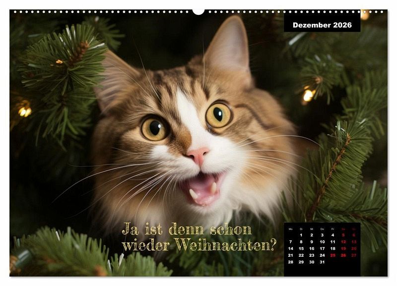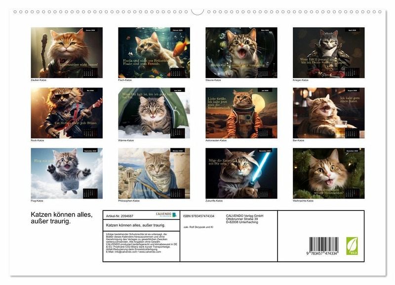 Katzen sind die beleibtesten Haustiere in Deutschland - vollkommen zu recht. Dieser Kalender wirkt einen etwas anderen, aber liebevollen Blick auf unsere pelzigen Freunde. Die mit KI erstellten Bilder zeigen viele bisher unbekannte Facetten - von der Samuraikatze, über die Weltraumkatze bis zum Weihnachtsbaumerklimmer. So haben sie Katzen noch nie gesehen. Drei Sachen haben ale Bilder gemeinsam: Katzen sind süß, überraschend und immer lustig. Der perfekte Kalender für alle Katzenfreunde, die auch Spaß verstehen.