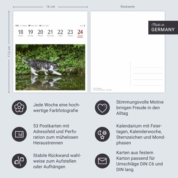 - Auf Samtpfoten durchs Jahr: Tischkalender mit 53 Postkarten mit Perforation zum Sammeln oder Verschicken - Bühne frei für cool cats: Kalender 2026 zum Aufhängen oder Aufstellen im Format 16 x 17,5 cm- Ein Muss für alle Katzen-Freund:innen: kleiner Kalender mit flauschig-weichen Katzenbabys und eleganten Stubentigern- Bringt jedes Heim zum Schnurren: Wochenkalender voller Katzenliebe, der Haustier-Fans zu verzaubern weiß- Schönes teilen, Freude schenken: die Postkartenkalender von Harenberg im Athesia Kalenderverlag