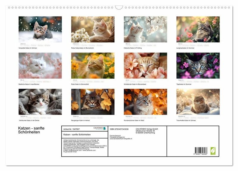 QUALITÄT - Hochwertiger Fotokalender mit 12 wunderschönen Motiven auf lichtbeständigem Bilderdruckpapier, robuste Spiralbindung mit Aufhängebügel.NACHHALTIG - deutliche Abfallreduzierung durch bedarfsgerechte Einzelstückfertigung, umweltfreundliches FSC-zertifiziertes Papier, Produktion in Deutschland, klimabewusste Logistik.PERFEKTES GESCHENK - Kalender für Freunde und Familie, für Kinder und Erwachsene, jung und alt, zu Weihnachten, Geburtstag oder zwischendurch.VIELFALT - Bildkalender in verschiedenen Formaten, z.B. DIN A5, DIN A4, DIN A3 sowie DIN A2. Ob Naturmotiv, Gemälde oder Fotos, ideal für ein persönliches Wohlfühlambiente.Lassen Sie sich jeden Monat aufs Neue durch die wunderbare Welt der Katzen verzaubern. von Autor(in): Daniela Bertschi