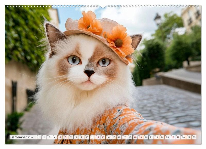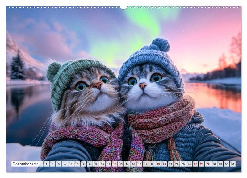 Wenn Katzen sich selbst ins beste Licht rücken könnten; dieser Kalender zeigt, wie es aussehen würde. Monat für Monat präsentieren sich Samtpfoten von ihrer charmantesten, frechsten oder flauschigsten Seite. Ob mit Schmollblick, Schnurrgrinsen oder coole Pose, diese Katzen-Selfies bringen garantiert jeden zum Schmunzeln. Die Szenen wurden liebevoll und fantasievoll mit künstlicher Intelligenz erschaffen.