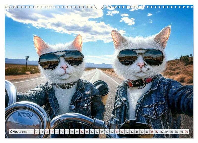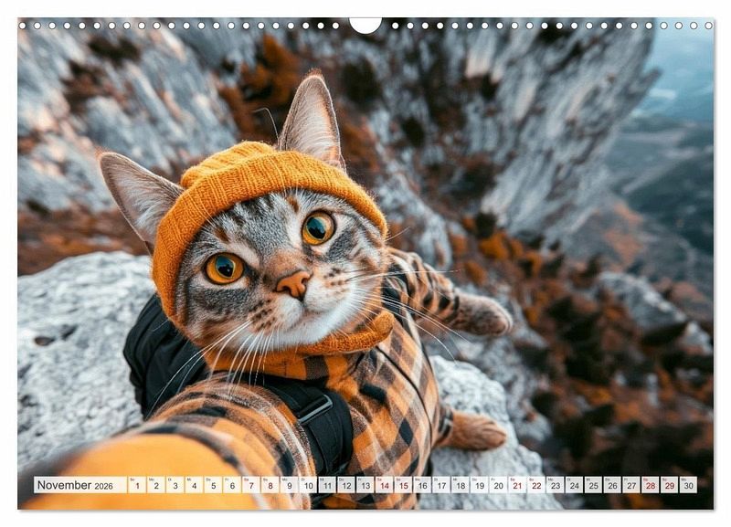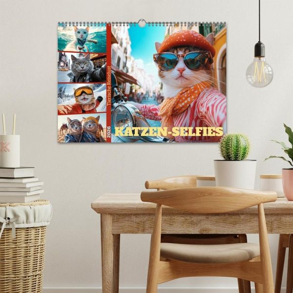 Wenn Katzen sich selbst ins beste Licht rücken könnten; dieser Kalender zeigt, wie es aussehen würde. Monat für Monat präsentieren sich Samtpfoten von ihrer charmantesten, frechsten oder flauschigsten Seite. Ob mit Schmollblick, Schnurrgrinsen oder coole Pose, diese Katzen-Selfies bringen garantiert jeden zum Schmunzeln. Die Szenen wurden liebevoll und fantasievoll mit künstlicher Intelligenz erschaffen.