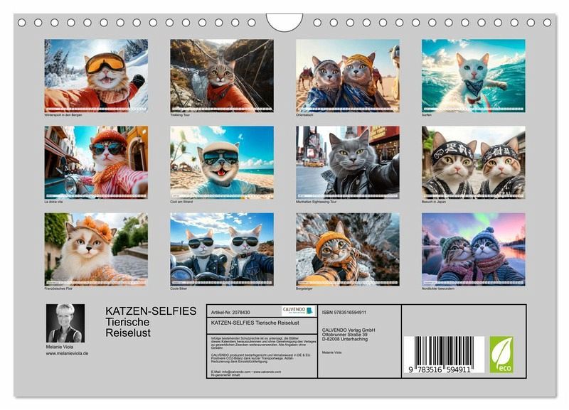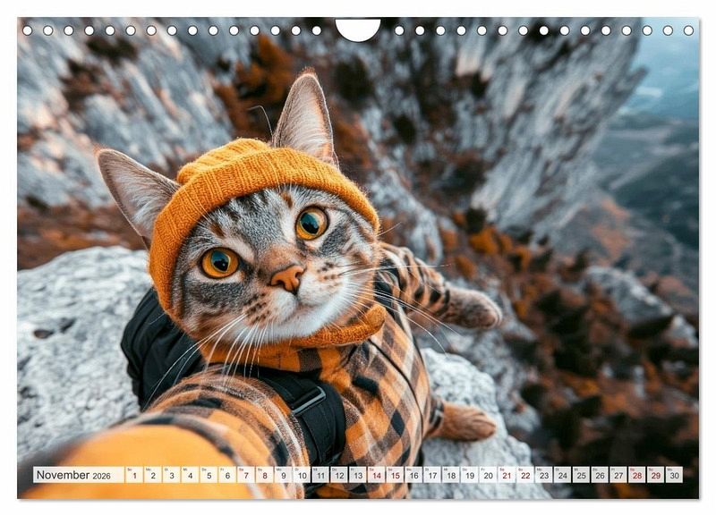 Wenn Katzen sich selbst ins beste Licht rücken könnten; dieser Kalender zeigt, wie es aussehen würde. Monat für Monat präsentieren sich Samtpfoten von ihrer charmantesten, frechsten oder flauschigsten Seite. Ob mit Schmollblick, Schnurrgrinsen oder coole Pose, diese Katzen-Selfies bringen garantiert jeden zum Schmunzeln. Die Szenen wurden liebevoll und fantasievoll mit künstlicher Intelligenz erschaffen.