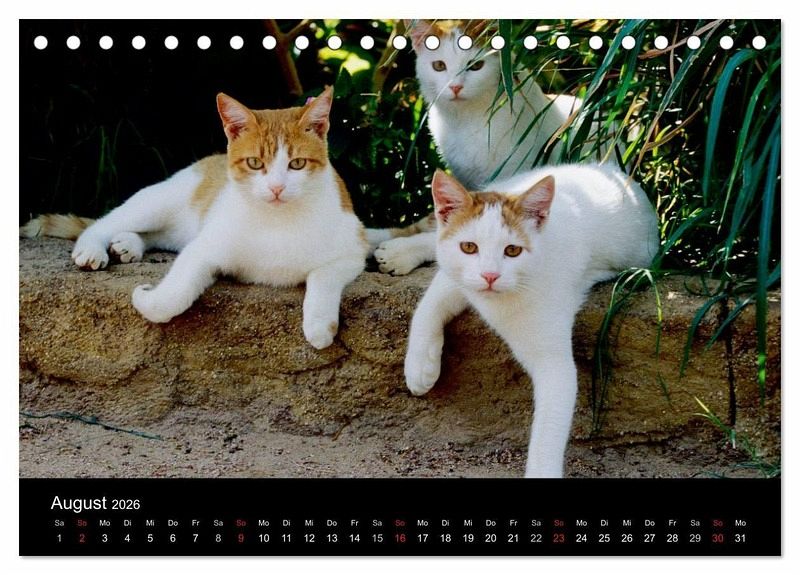 August: Drei rot-weiße Katzen relaxen im Garten