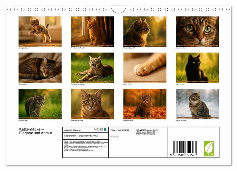 Zwölf faszinierende Katzenporträts begleiten dich durch das Jahr - verspielt, geheimnisvoll und anmutig. Jede Aufnahme fängt die Seele dieser Tiere ein: leuchtende Augen, seidiges Fell, liebevolle Details. Dieser hochwertige Katzenkalender 2025 ist mehr als Deko - er ist eine Hommage an die Eleganz und Ausdruckskraft unserer Samtpfoten. Perfekt als Geschenk für Katzenliebhaberinnen, Tierfreundinnen und alle, die ihre Wände mit kunstvollen Momenten und Herzenswärme schmücken möchten.