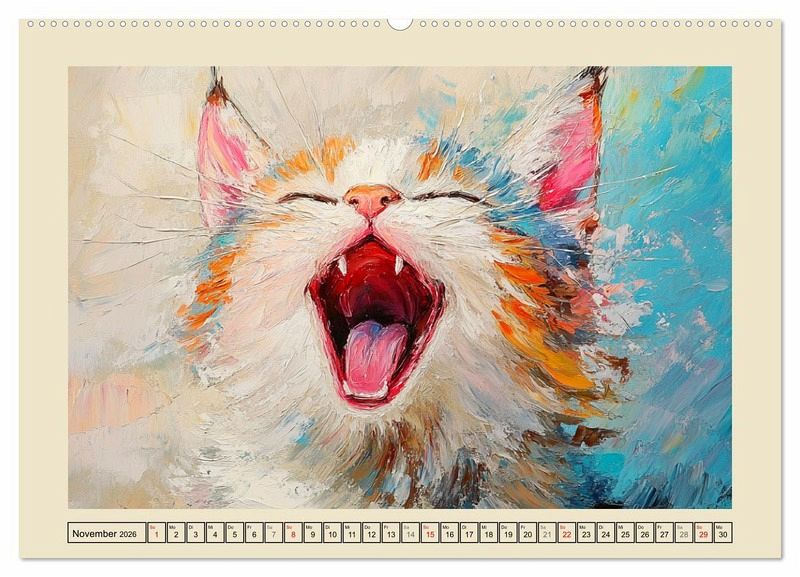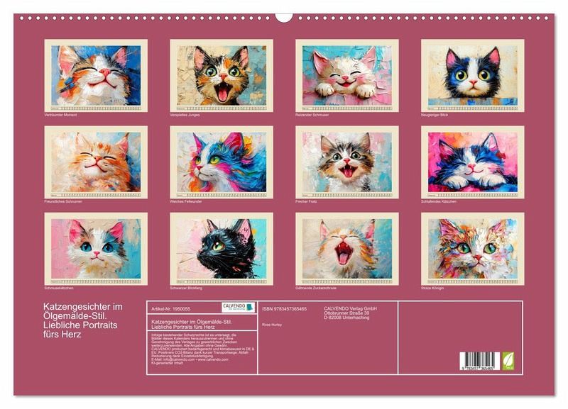 Dieser Kalender zeigt 12 zauberhafte Katzenportraits im Ölgemälde-Stil. Jede Katze wurde mit Hilfe von KI erstellt und bringt ihren eigenen Charme und eine unverwechselbare Persönlichkeit mit. Perfekt für Katzenliebhaber, die jeden Monat ein neues, niedliches Gesicht begrüßen möchten. Lassen Sie sich von diesen künstlerischen Darstellungen verzaubern und erleben Sie ein Jahr voller Katzenliebe.