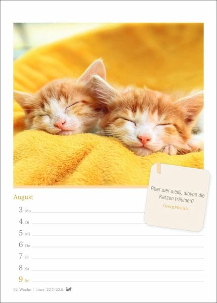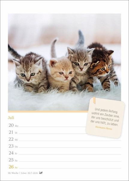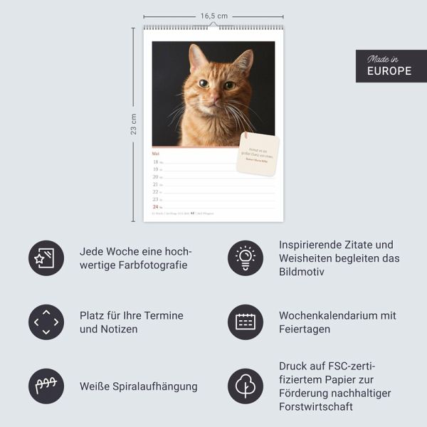 - Rund ums Jahr jede Menge Katzenliebe: Kleiner Kalender für die Wand im Hochformat 16 x 23 cm mit viel Platz für Notizen- Bühne frei für Samtpfoten jeder Couleur: Wochenplaner 2026 mit 53 hochwertigen Aufnahmen anmutiger Miezen und cooler Cats- Für das Kitten in dir: Kleiner Planer fürs Büro oder zuhause mit flauschig-weichen Katzenbabys und amüsanten Zitaten- Das ideale Geschenk für Katzenliebhaber:innen: Wandkalender zum Eintragen mit lustigen Fotos süßer Stubentiger- So macht Pläne schmieden Spaß: die Wandplaner von Harenberg im Athesia Kalenderverlag