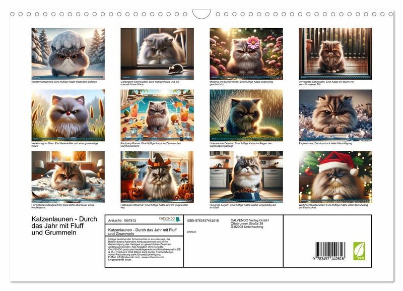 Entdecken Sie die Welt außergewöhnlich grummeliger Katzen, eingefangen in einzigartigen Szenen für jeden Monat - ein Meisterwerk der künstlichen Intelligenz. Diese Sammlung bringt Fluff und Grummeln direkt zu Ihnen nach Hause, perfekt für Katzenfreunde, die das Außergewöhnliche suchen. Ein unvergessliches Erlebnis, das Humor und die Schönheit der Jahreszeiten vereint.