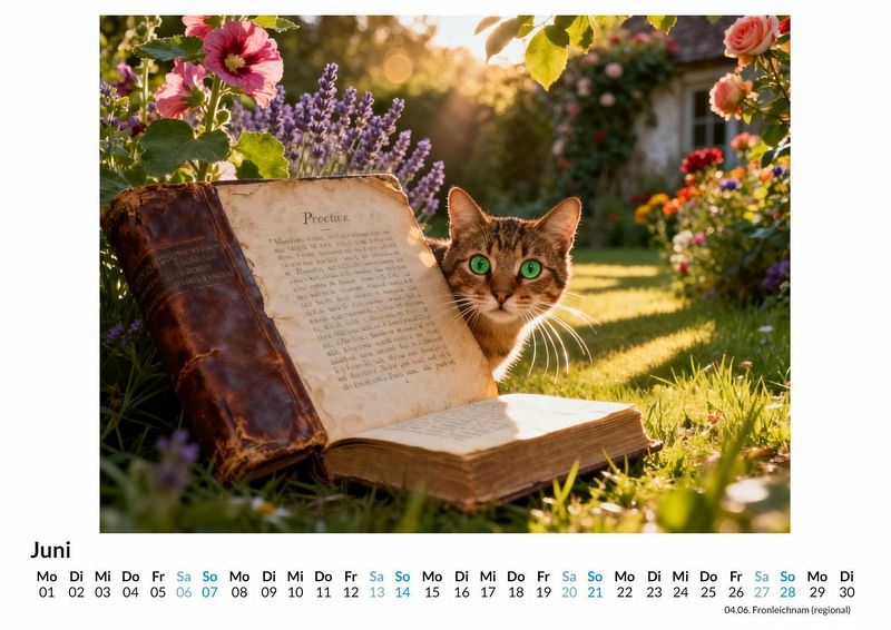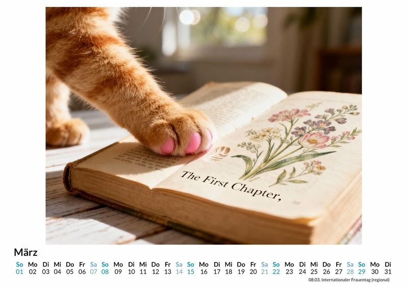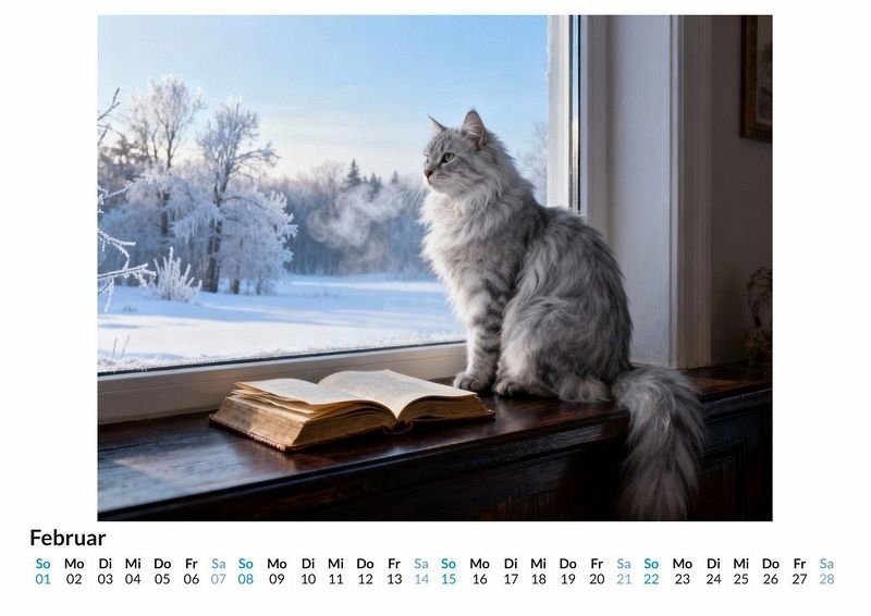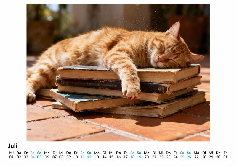 Eine schnurrende Katze auf einem Stapel alter Bücher, das sanfte Rascheln von Seiten in einer stillen Bibliothek. Der Kalender "Katzenmotive mit literarischem Bezug" fängt genau diese Momente ein und verbindet die Welt der Literatur mit der eleganten Anmut von Katzen. Dieser Kalender ist eine ideale Wahl: * Für alle, die die Gesellschaft von Katzen und guten Geschichten schätzen. * Für Leseratten, die ihre Leidenschaft für Bücher auch an der Wand zeigen möchten. * Für Menschen, die eine ruhige und nachdenkliche Atmosphäre in ihren Räumen schaffen wollen. Jeder Monat präsentiert eine neue Szene, in der Samtpfoten zu den Hütern geschriebener Worte werden. Sie dösen auf Klassikern, blicken neugierig aus dem Fenster einer alten Studierstube oder spielen zwischen aufgeschlagenen Manuskripten. Jedes Monatsblatt ist das Ergebnis einer Zusammenarbeit zwischen menschlicher Vision und der schöpferischen Kraft moderner Algorithmen, die diese literarischen Katzenträume zum Leben erweckt. Was dieser Kalender bietet: * Zwölf sorgfältig ausgewählte Monatsmotive, die Katzen und Bücher in Szene setzen. * Ein praktisches Kalendarium für die Organisation des Alltags. * Ein dekoratives Element für das Zuhause oder das Büro. Der Kalender "Katzenmotive mit literarischem Bezug" ist eine Hommage an die stillen Momente des Lesens und die beruhigende Präsenz von Katzen. Eine Einladung, sich die einzelnen Monatsblätter anzusehen und die kleinen Geschichten darin zu entdecken.