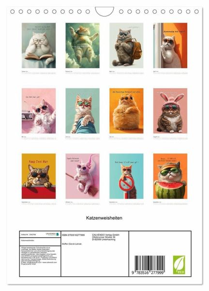 QUALITÄT - Hochwertiger Fotokalender mit 12 wunderschönen Motiven auf lichtbeständigem Bilderdruckpapier, robuste Spiralbindung mit Aufhängebügel.NACHHALTIG - deutliche Abfallreduzierung durch bedarfsgerechte Einzelstückfertigung, umweltfreundliches FSC-zertifiziertes Papier, Produktion in Deutschland, klimabewusste Logistik.PERFEKTES GESCHENK - Kalender für Freunde und Familie, für Kinder und Erwachsene, jung und alt, zu Weihnachten, Geburtstag oder zwischendurch.VIELFALT - Bildkalender in verschiedenen Formaten, z.B. DIN A5, DIN A4, DIN A3 sowie DIN A2. Ob Naturmotiv, Gemälde oder Fotos, ideal für ein persönliches Wohlfühlambiente.Katzenweisheiten sind kurze, prägnante Sprüche oder Zitate, die die Eigenschaften und Verhaltensweisen von Katzen auf humorvolle, kluge oder inspirierende Weise erfassen. von Autor(in): Steffen Gierok ; Magik Artist Design