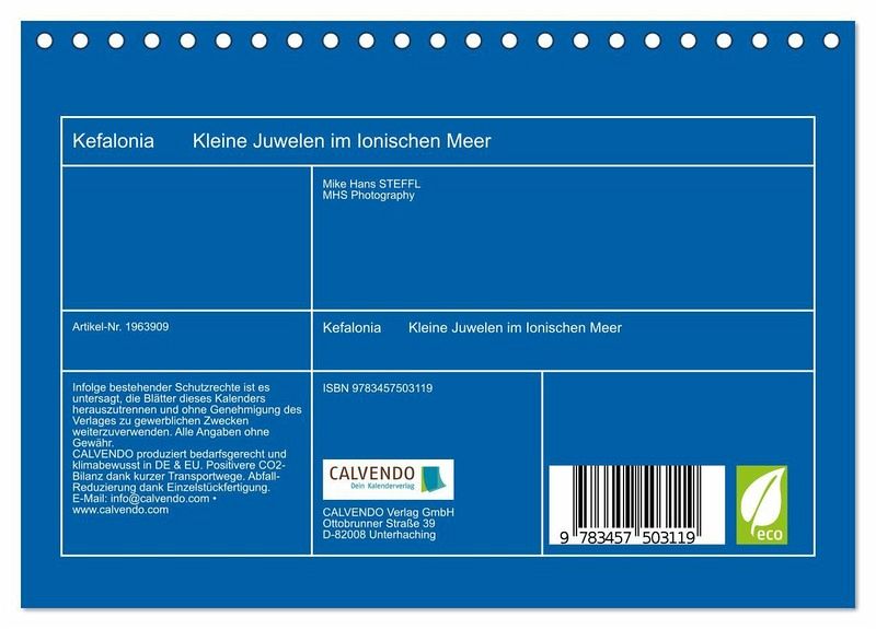 Begleiten Sie uns auf eine unvergessliche Reise zu einer der atemberaubendsten Inseln Griechenlands - Kefalonia! Dieser wunderschöne Kalender entführt Sie Monat für Monat in eine Welt voller Magie und Abenteuer. Lassen Sie sich von den kleinen Juwelen verzaubern, die diese Perle im Ionischen Meer zu bieten hat.