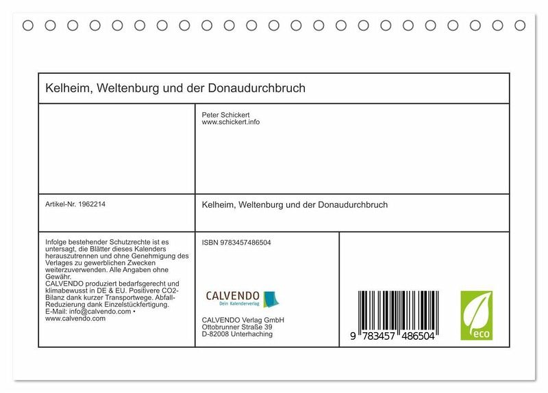 Dieser faszinierenden Kalender vom Reisefotografen Peter Schickert zeigt neben den Höhepunkten der Stadt Kelheim wie der Befreiungshalle auch eine der spektakulärsten Naturlandschaften Deutschlands - den Donaudurchbruch der Weltenburger Enge.