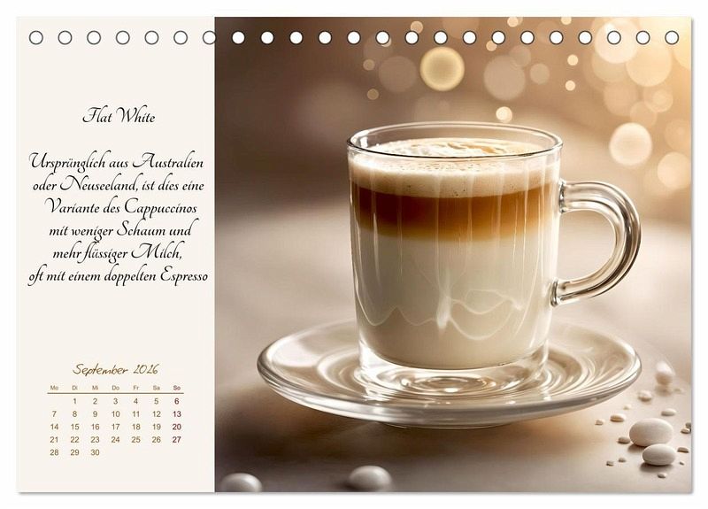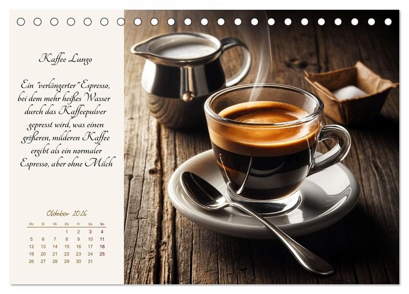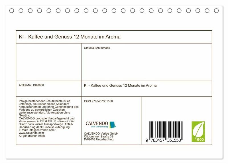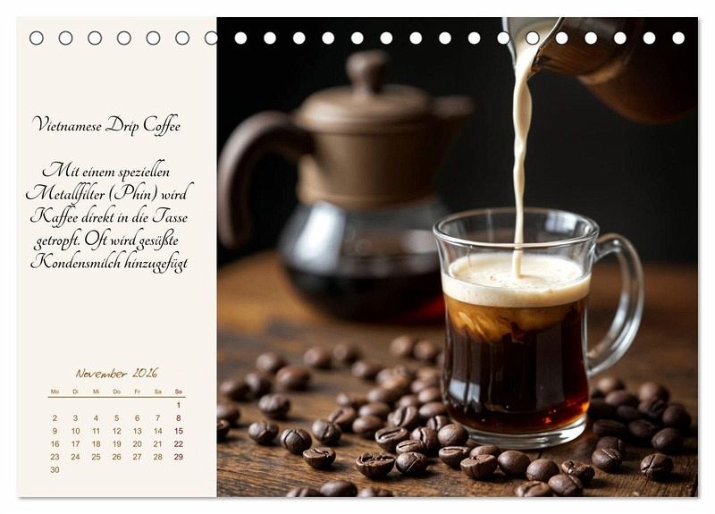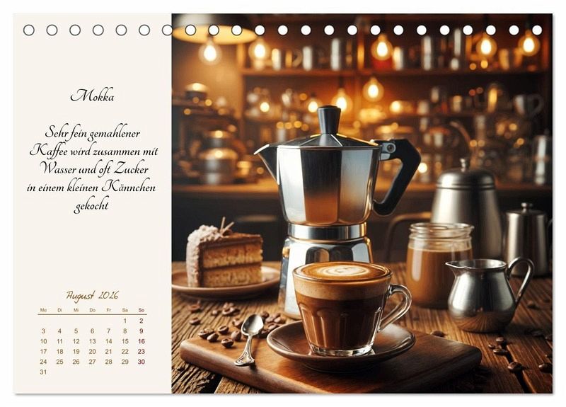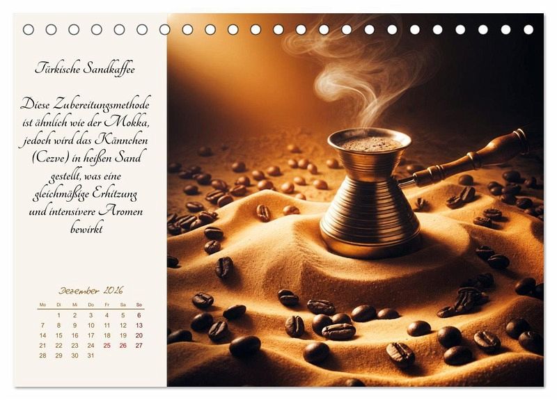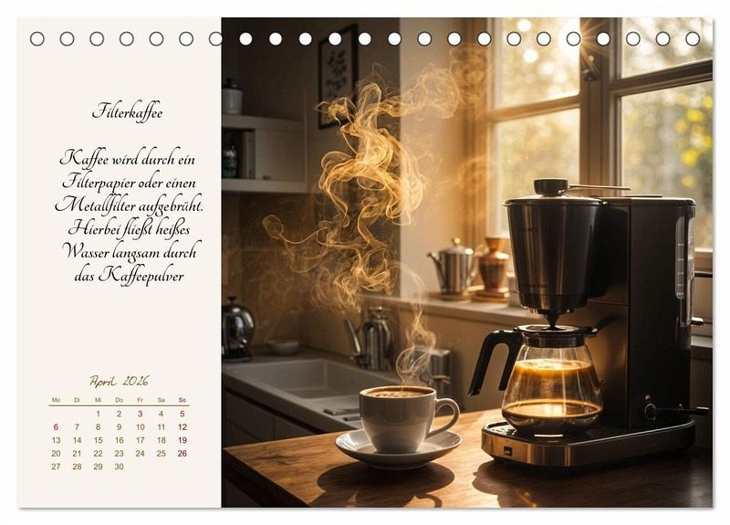 Tauchen Sie ein in die faszinierende Welt der Kaffeezubereitung! Unser exklusiver KI-Kalender nimmt Sie mit auf eine Reise durch 12 Monate voller Kaffeekultur. Jedes Blatt zeigt eindrucksvolle Bilder der verschiedenen Zubereitungsmethoden - von der traditionellen French Press bis hin zum exotischen türkischen Sandkaffee. Perfekt für Kaffeeliebhaber und Genießer: Lassen Sie sich jeden Monat von neuen Kaffeekreationen inspirieren und lernen Sie mehr über die Handwerkskunst hinter jeder Tasse. Machen Sie Ihre Wände zum Kunstwerk - und Ihre Küche zum Café! Jetzt bestellen und täglich die Liebe zum Kaffee erleben!