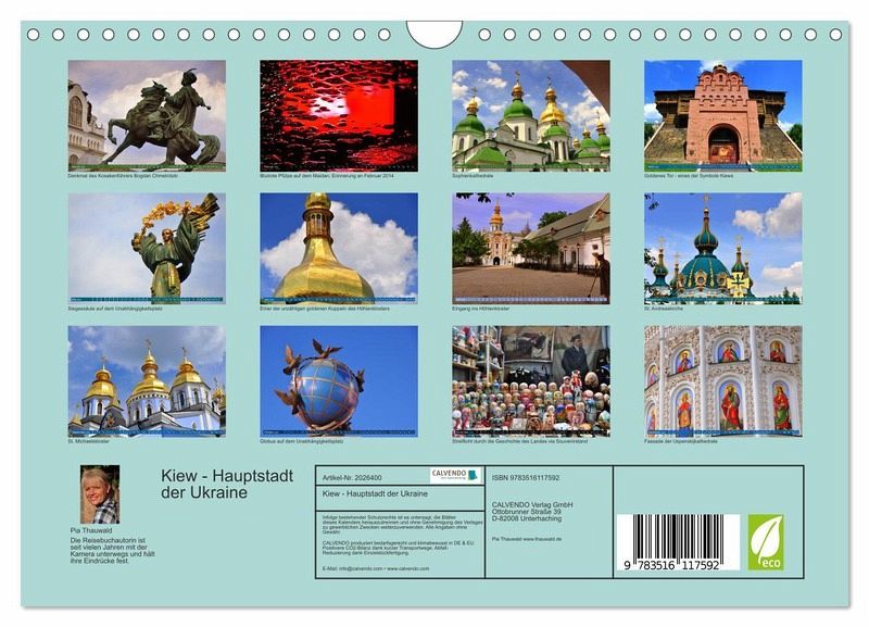 Kiew ist nicht nur die Hauptstadt der Ukraine; sie ist auch eine pulsierende Metropole mit reicher kultureller Vergangenheit und sich rasch entwickelnder Moderne. Und doch ist die Millionenstadt am Dnjepr für viele erst seit dem Ukraine-Konflikt und die (blutigen) Demonstrationen auf dem Unabhängigkeitsplatz, dem Maidan, in den Fokus des Interesses gerückt. Der Kalender zeigt symbolische wie schöne Facetten einer Stadt im Wandel.