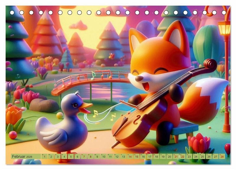 Februar: Fuchs und eine Ente, unzertrennliche Freunde, spielen gemeinsam eine Symphonie der Freundschaft