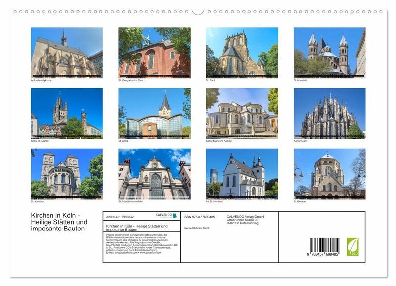 Der Kalender nimmt Sie mit auf einen Rundgang durch die Hansestadt Köln und zeigt Ihnen eine Auswahl der schönsten und prachtvollsten Kölner Kirchen. Genießen Sie die mehr oder weniger bekannten historischen Highlights der Domstadt.